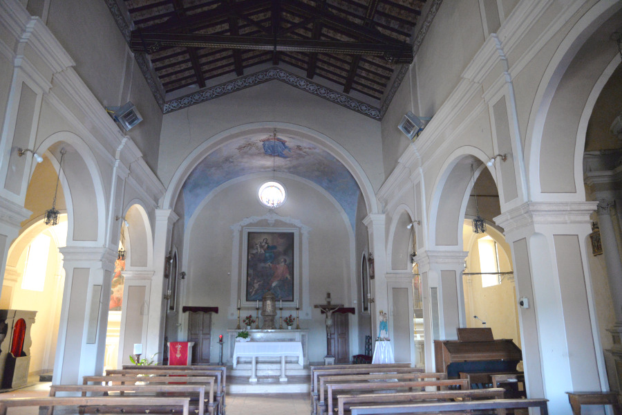 Sul lato sud-ovest del portico c'è una lunga panca in muratura che porta alla porta della sagrestia. La chiesa ha tre campate con volta a crociera su pilastri tuscanici semplificati lungo la parete. La campata intermedia ha due finestre simmetriche che forniscono luce insieme a quelle sulla controfacciata.