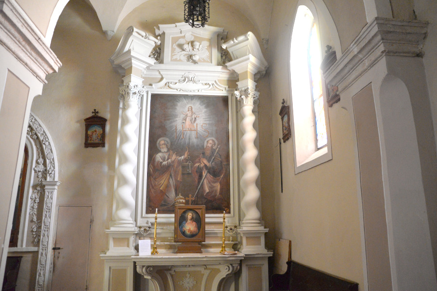 Accanto, due porte immettono nella sagrestia: un vano rettangolare finestrato con bagno, coperto con un soffitto piano ligneo con le travi poste in evidenza.